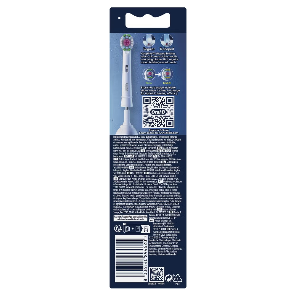 The Oral-B Pro 3D White toothbrush head features an exclusive polishing cup that whitens teeth starting from day 1 by removing surface stains. Oral-B genuine brush heads are designed with new X-shape bristles that clean in areas that round ones cannot reach. Its brush head usage indicator turns bristles from green to yellow showing you when to change for 100% cleaning efficacy. Guaranteed fit with Oral-B electric rechargeable toothbrushes except Pulsonic & iO toothbrushes.