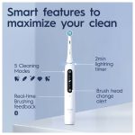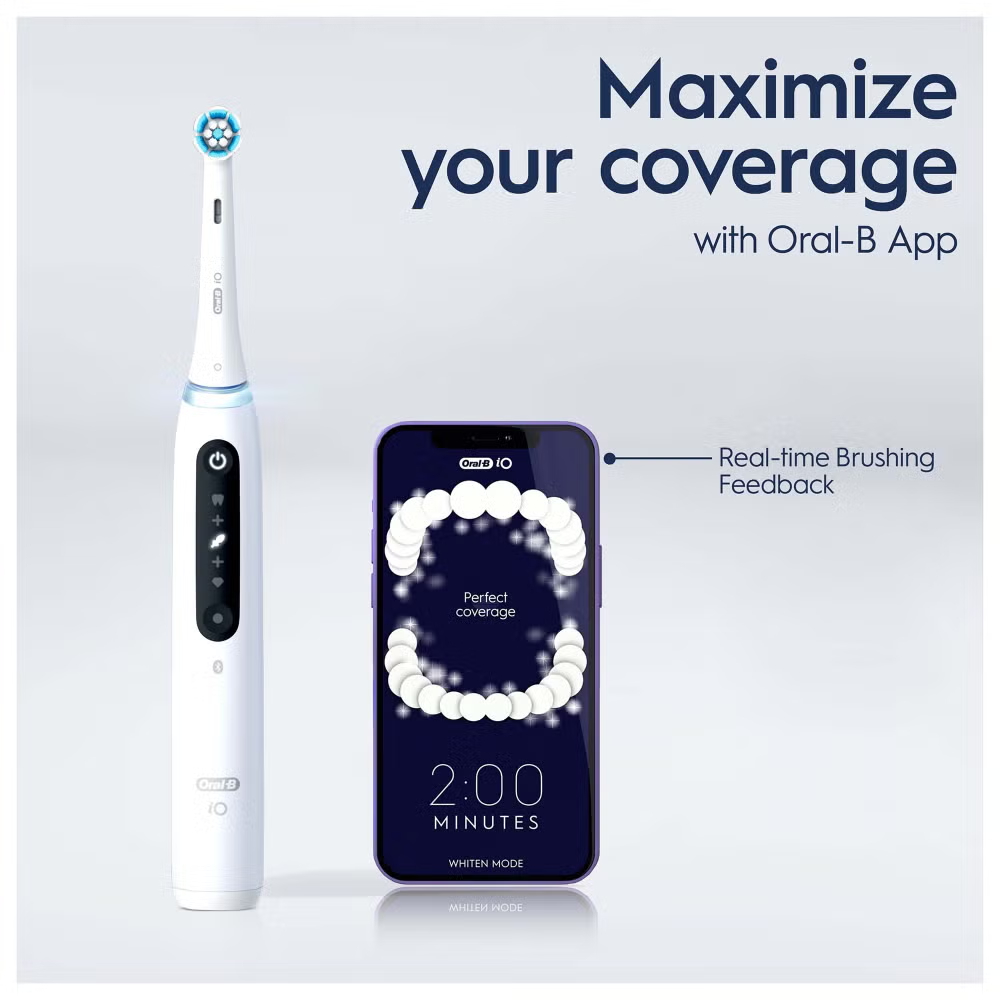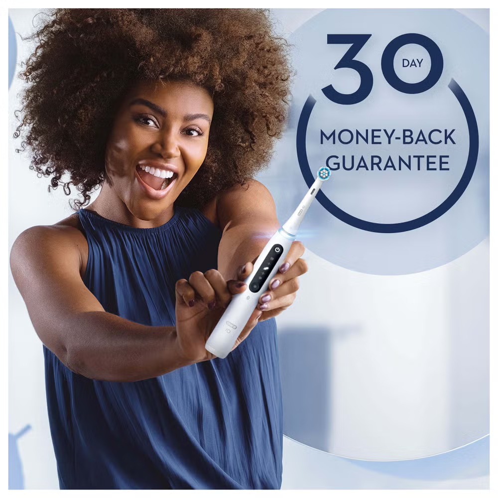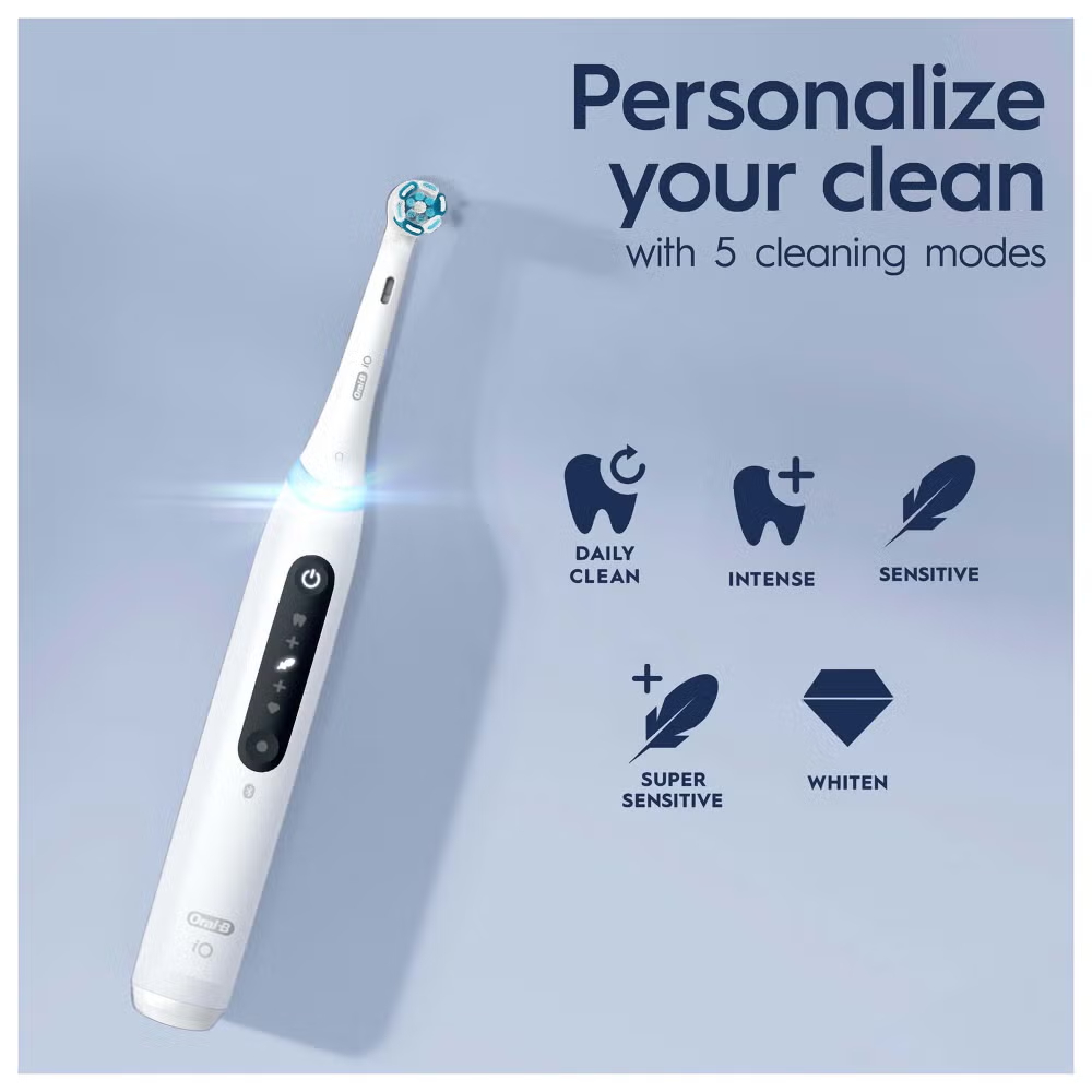 The iO 5 electric toothbrush features Oral-B’s best technology, combining a dentist-inspired round brush head with micro-vibrating bristles for a professional purifying clean feel at home. The Smart Pressure Sensor helps prevent you from brushing either too hard or too softly to better protect your gums. A.I. Brushing Recognition recognises your brushing style and guides you to better brushing every day. Connects to the free Oral-B App for real-time brush tracking & guidance across 6 brushing zones. Replace your Oral-B iO toothbrush head every 3 months for the best results.