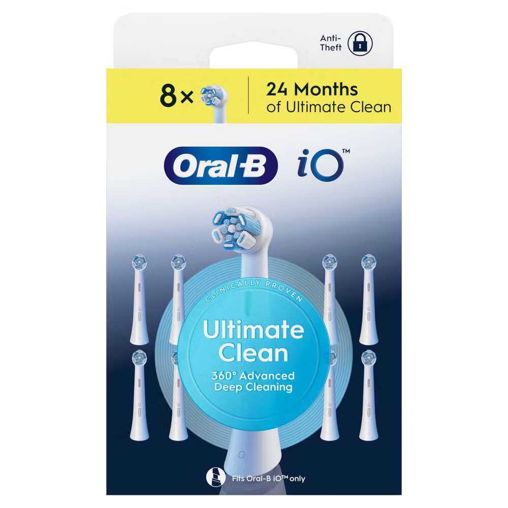 The Oral-B iO Series Ultimate Clean Replacement Brush Heads combine powerful but gentle micro-vibrations with our unique, dentist-inspired round brush head design for a professional clean feeling every day. Designed exclusively for Oral-B iO electric toothbrush handles, the Ultimate Clean brush heads help remove up to 100% more plaque than a regular, manual toothbrush, leaving teeth feeling clean and bright. Precisely angled at 16 degrees, tufted bristles help clean hard-to-reach areas of the mouth. Since dentists recommend changing your toothbrush head every 3 months for best results, Oral-B replacement brush heads feature color-changing bristles that signal when it’s time for a change by fading to white. Enjoy superior cleaning power with the only refill brush heads designed exclusively for – and guaranteed to fit – your Oral-B iO electric toothbrush.