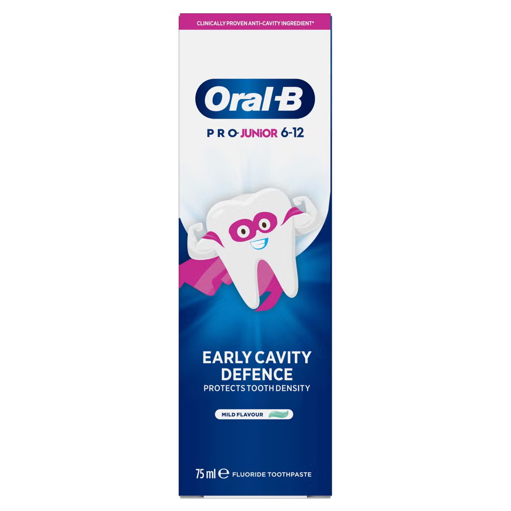 Oral-B Pro Junior toothpaste is especially designed for children between 6 – 12 years old. It’s developed with dentists to help prevent cavities by protecting teeth against everyday acids and sugars. It contains an age-appropriate level of fluoride that aids in protecting enamel and comes in a mild mint flavour.