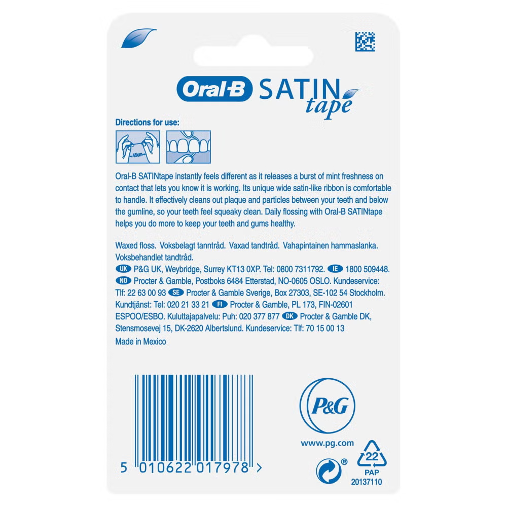 Oral-B Satin Tape floss instantly feels different as it releases a burst of mint freshness on contact that lets you know it is working. Its unique wide satin-like texture is comfortable to handle. It effectively cleans out plaque and particles between your teeth and below the gum line, so your teeth feel squeaky clean. Daily flossing with Satin Tape Floss you do more to keep your teeth and gums healthy.